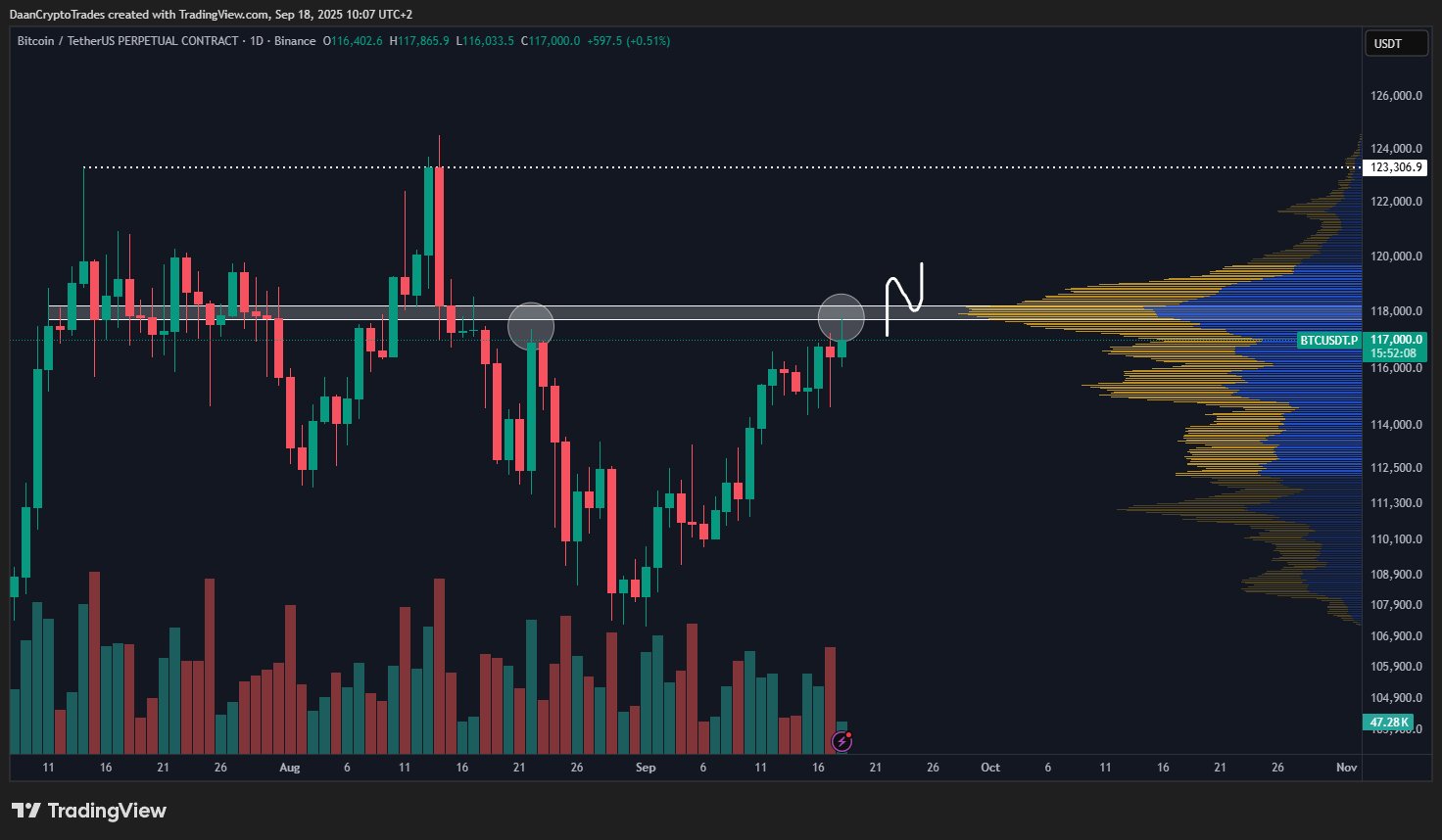 Popular trader Daan Crypto Trades agreed on the significance of the $118,000 mark. During dovish comments by Fed Chair Jerome Powell at the Jackson Hole symposium in August, that level formed a local top as BTC price action strengthened.