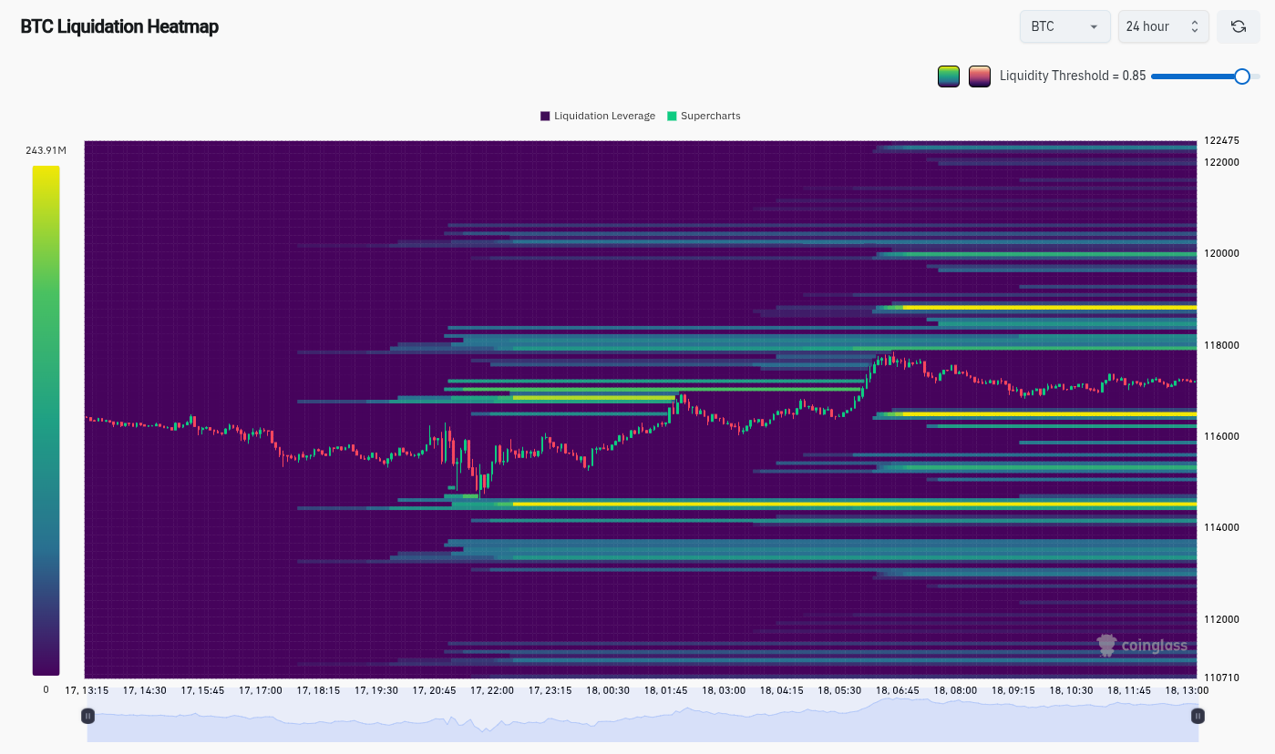 Data from CoinGlass thus put $116,500 and $119,000 as the key levels to watch for on the day.