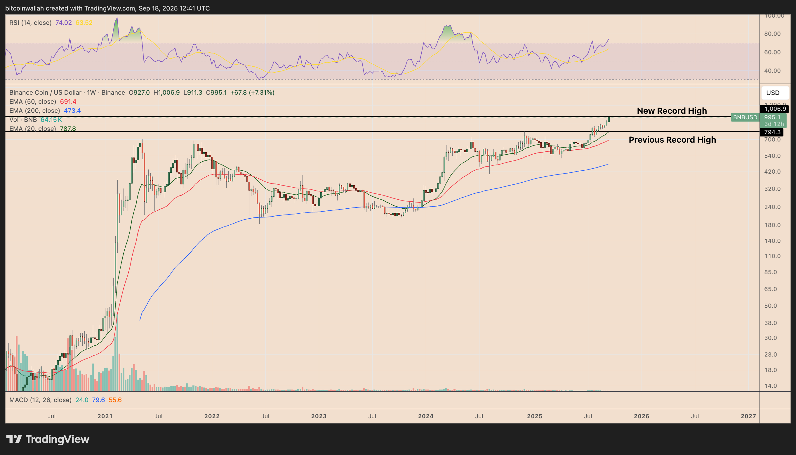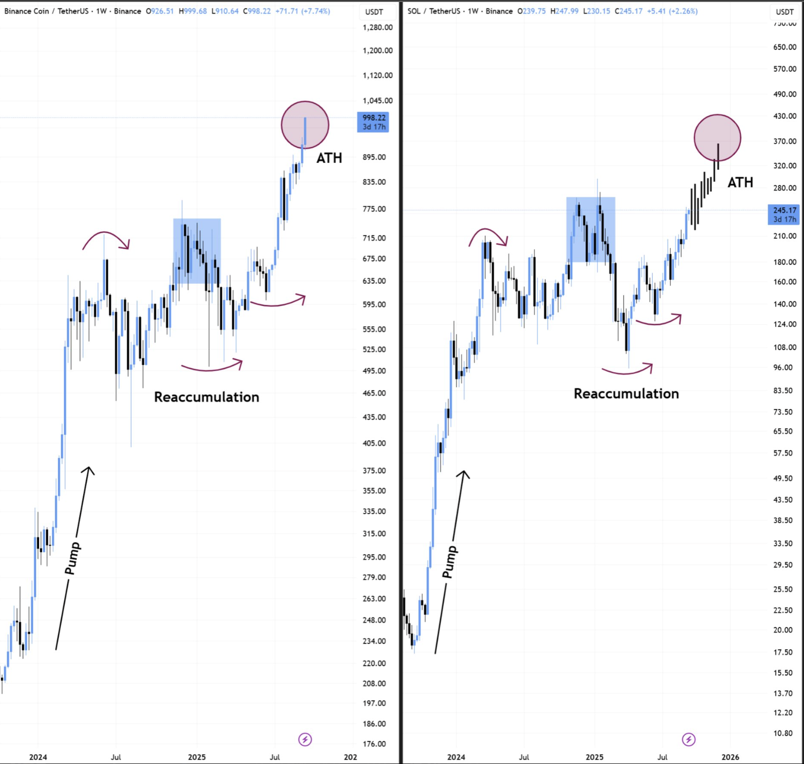 For BNB, this setup matured in August 2025, when it reclaimed its previous all-time high of $794.30. The breakout quickly gathered momentum, and within weeks, BNB extended its rally to a new record peak above $1,000 today.