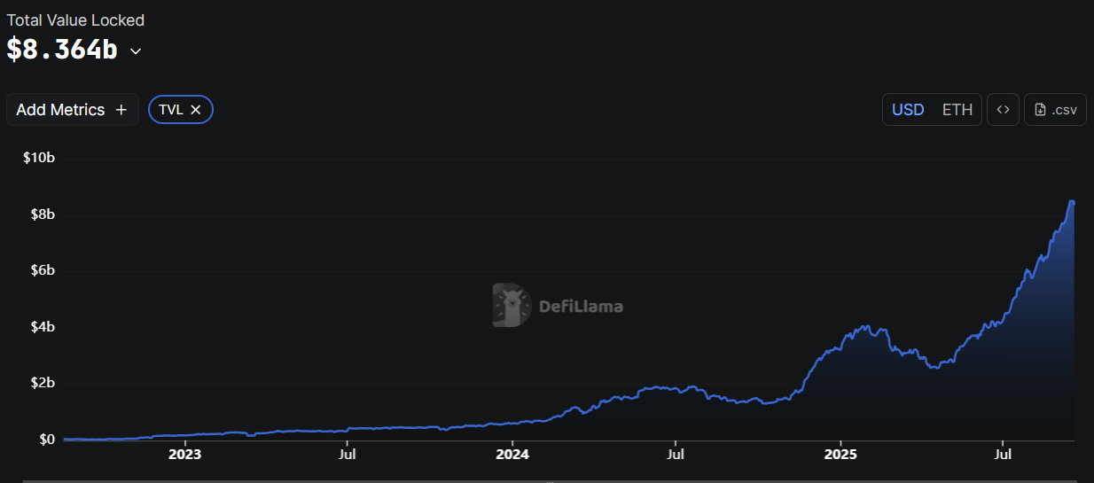 Morpho ranks among the largest decentralized lending protocols in crypto, with more than $8.3 billion in total value locked (TVL), according to DefiLlama. The protocol’s dollar-denominated TVL has climbed sharply this year, reflecting growing demand for onchain lending.