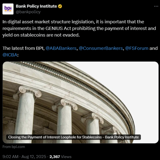 In August, the Bank Policy Institute (BPI) — a lobbying group backed by major US banks — urged regulators to close what it described as a loophole that might permit exchanges or affiliates to provide yield through third-party partners.