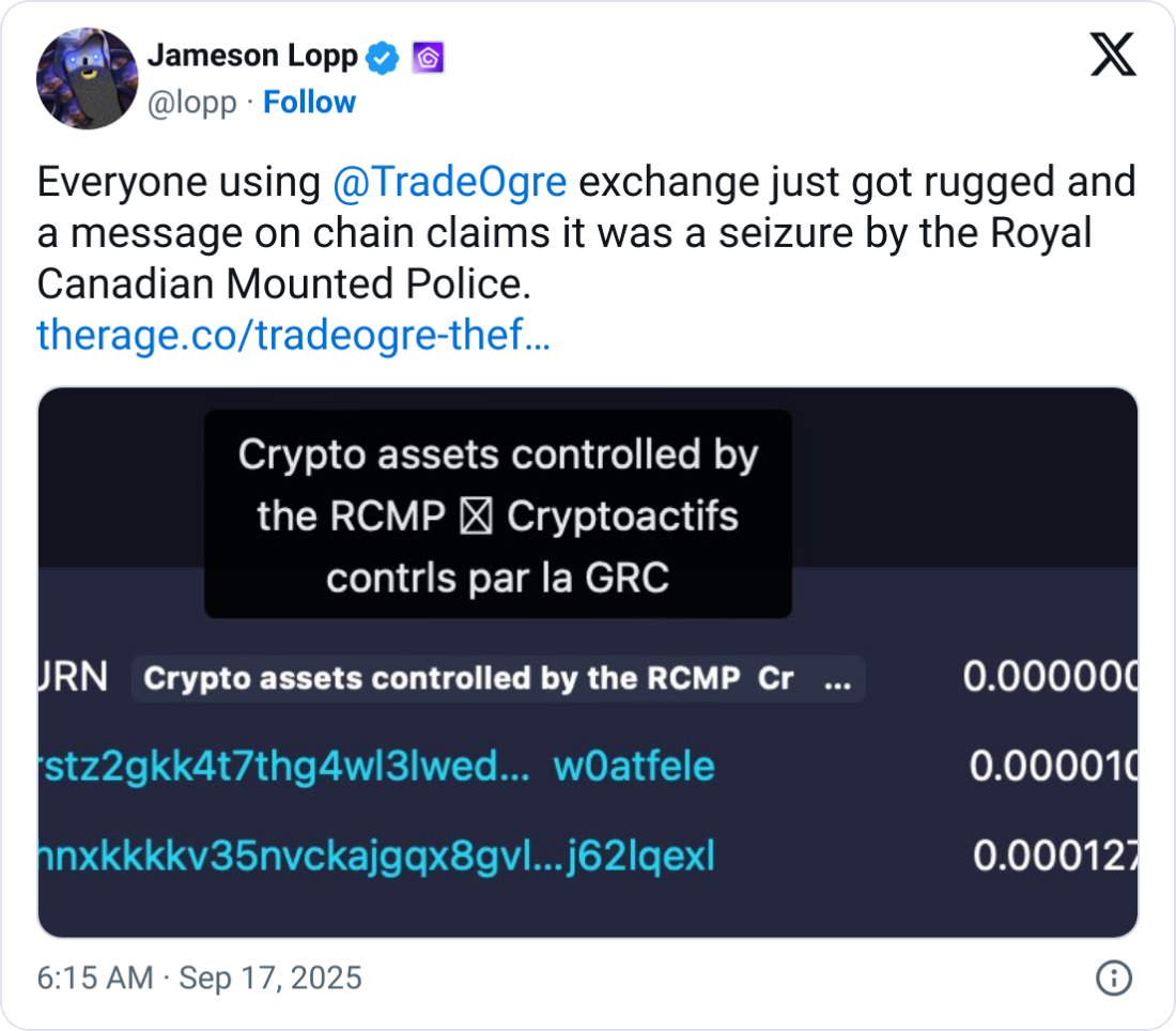 The Rage reported a possible RCMP takedown of TradeOgre on Tuesday, as a Bitcoin transaction tied to TradeOgre was embedded with the message “Crypto assets controlled by the RCMP.”