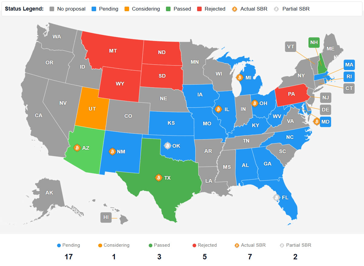 Strategic Bitcoin reserve bills have been rejected in Montana, North Dakota, South Dakota, Wyoming and Pennsylvania, and there are 17 other states with pending legislation, according to Bitcoin Reserve Monitor.