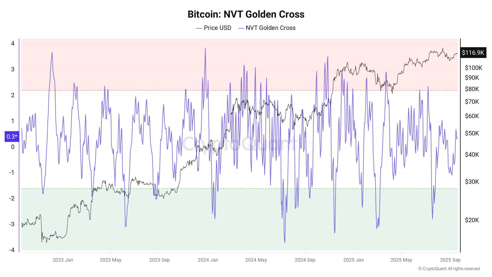 NVT-GC has an impressive recent track record. Its previous four dips into the “long” zone all resulted in BTC price gains, including in August 2024.
