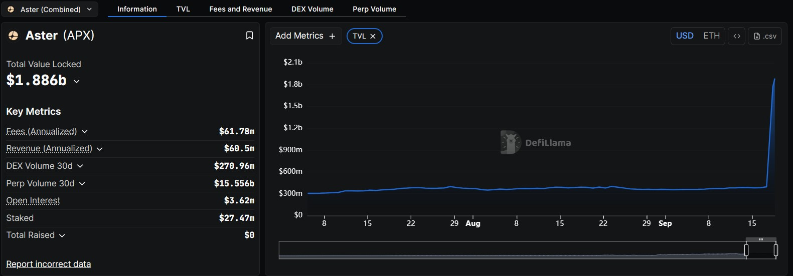 BNB Chain-based decentralized perpetuals exchange Aster briefly crossed $2 billion in total value locked (TVL) Thursday after launching its native token, before falling back sharply, according to DefiLlama data.