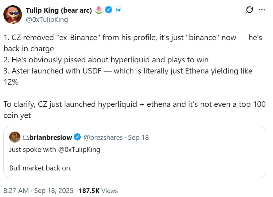 Binance co-founder Changpeng “CZ” Zhao congratulated Aster on X, writing “keep building.” The comment sparked speculation that Zhao may be behind the project, with some users pointing to changes in his profile and suggesting Aster was launched in response to Hyperliquid’s growth.