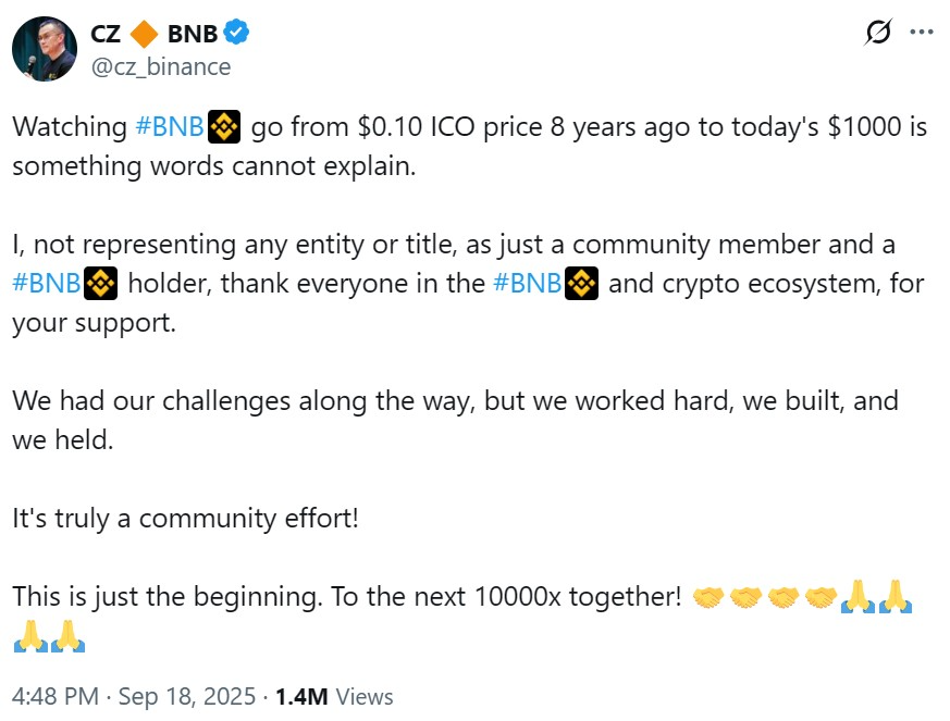 When BNB hit $1,000 for the first time on Thursday, Zhao emphasized this point in a celebratory post on X.