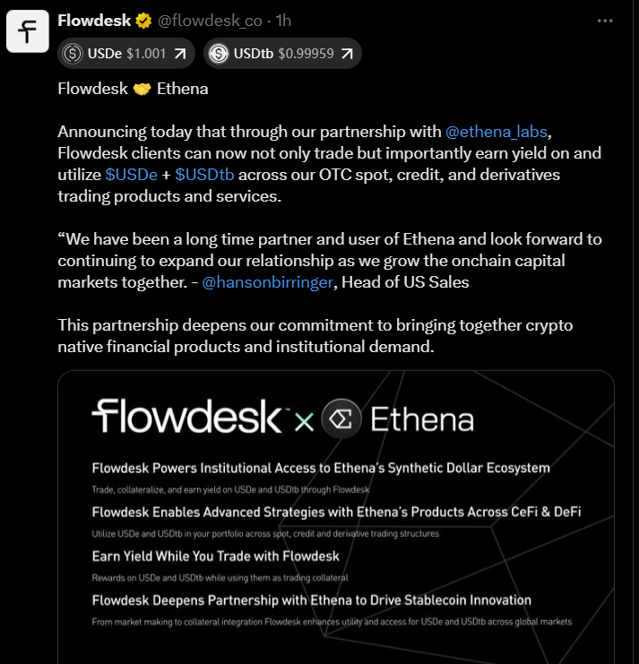 The rapid growth of the Ethena stablecoin ecosystem continued on Friday as Ethena Labs announced a partnership with institutional OTC desk Flowdesk, aimed at expanding access to its two tokens — USDe and USDtb.