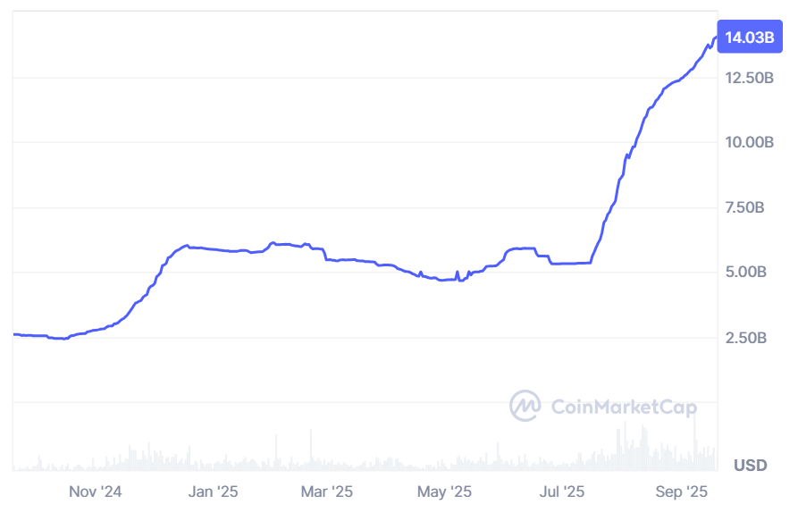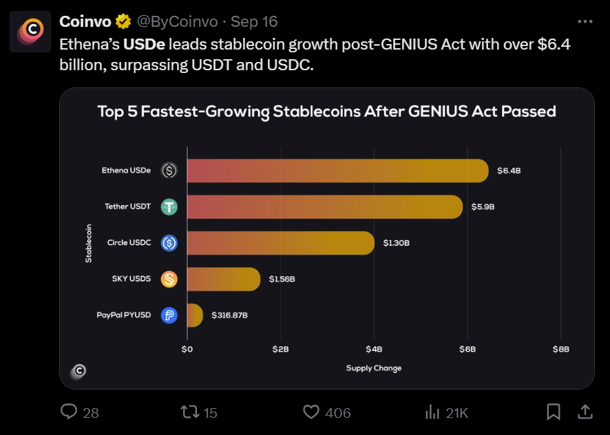 The announcement comes as USDe surpassed $14 billion in market capitalization, according to CoinMarketCap, with its circulating supply climbing 21% over the past month. That growth has propelled USDe into the position of the third-largest stablecoin by market cap, trailing only USDT and USDC.