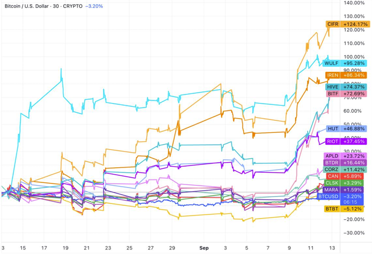 According to The Miner Mag’s latest industry report, public miners including Cipher Mining (CIFR), Terawulf (WULF), Bitfarms (BITF), Hive Digital Technologies (HIVE) and Iris Energy (IREN) each gained at least 73% over the past month. In the same period, Bitcoin has edged lower.