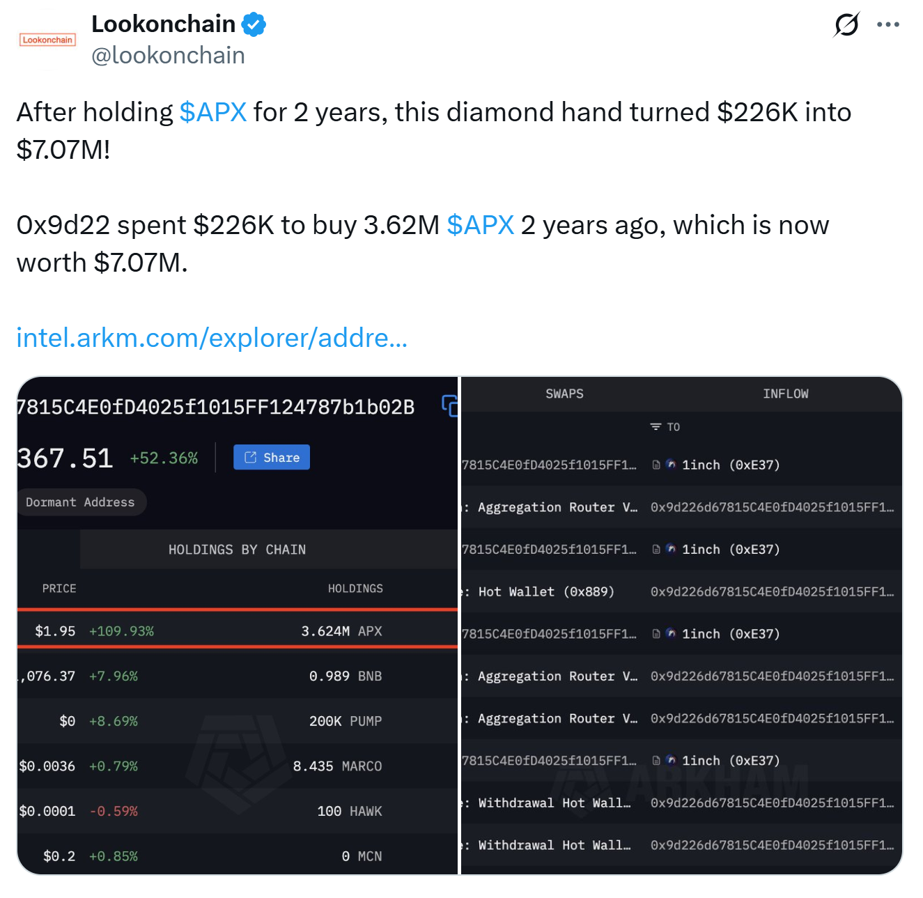According to data from Arkham Intelligence, wallet 0x9d22 accumulated 3.62 million APX tokens in 2022 through a series of swaps and transfers. At the time, the token was trading below $0.07. With APX now hovering around $1.95, that same stash is worth $7.07 million.