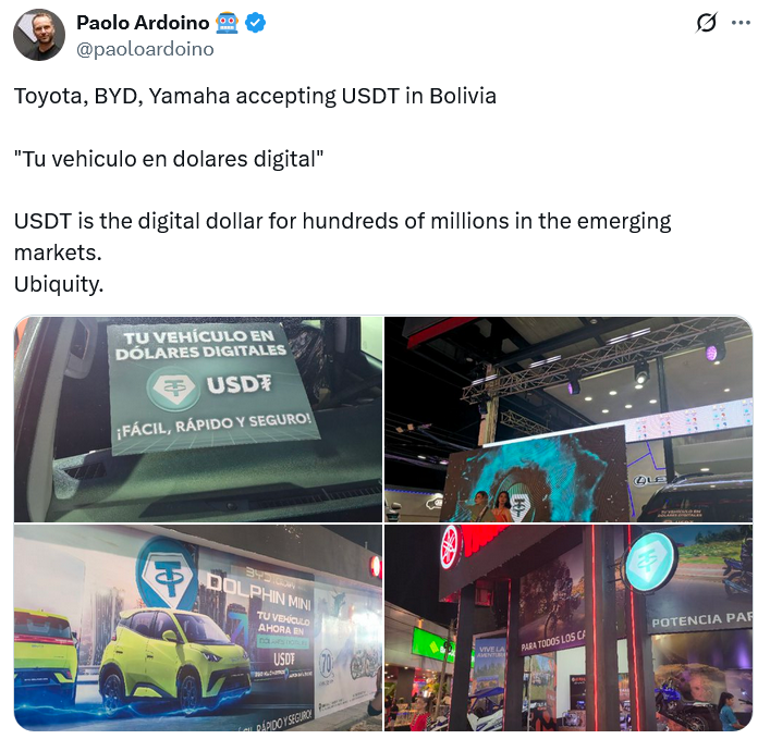 Tether CEO Paolo Ardoino shared that Toyota, Yamaha, and BYD are taking Tether (USDT) for payment on Sunday, while crypto security firm BitGo confirmed the first Toyota was purchased in Bolivia with USDT on Saturday.