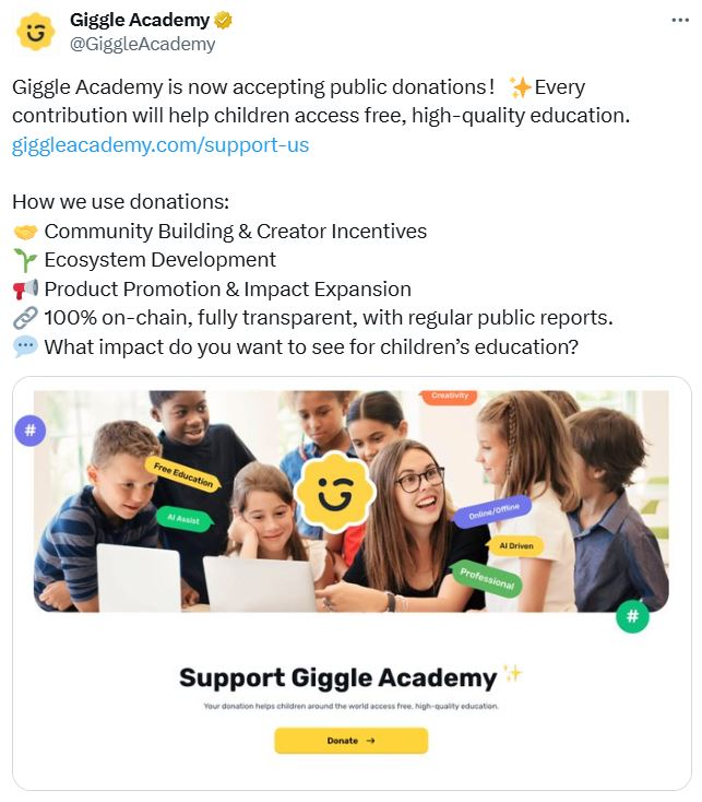 Giggle Academy said all donations are being used for community building, creator incentives, ecosystem development, plus product promotion. The project’s concept paper proposes a system where teachers can contribute educational material and offer rewards for the best performing, allowing the next to “rise to the top.”