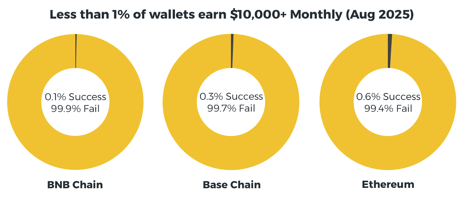 Even in bullish periods, only 4% earn more than $100 a month, while the rest struggle to keep up. The truly consistent high earners, wallets clearing over $10,000 in profit, account for less than one percent on major chains like Ethereum, Base and BNB.