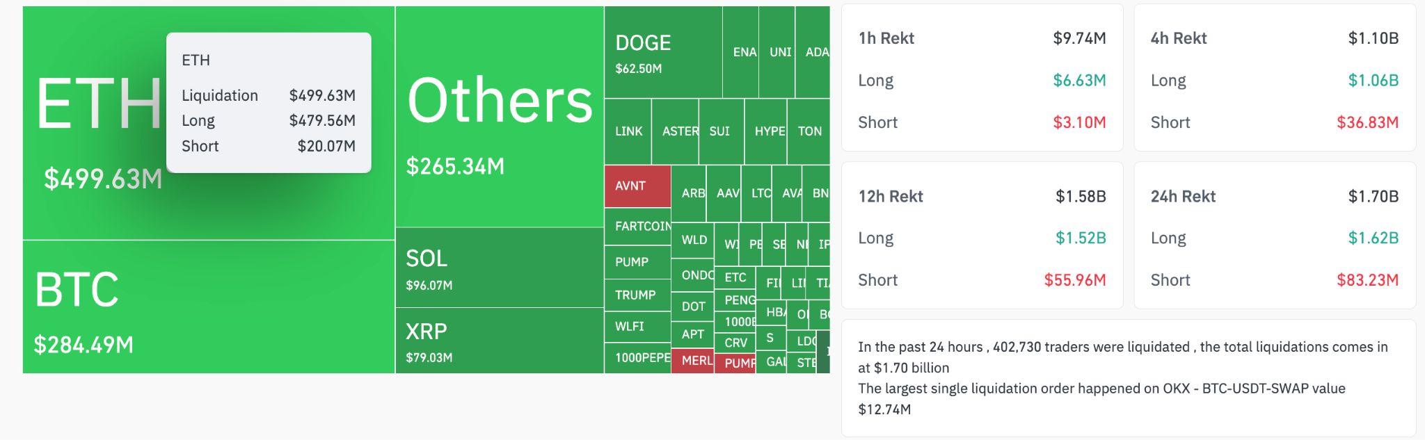 Across the board, a total of $1.7 billion was wiped out of the market in short and long positions, as shown in the figure below.