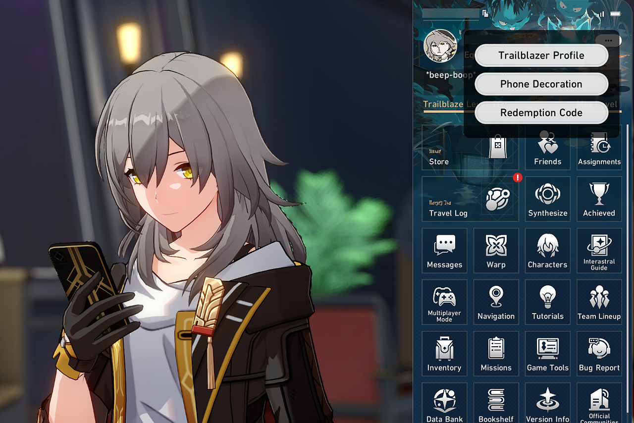 Open the phone menu, press the three dots at the top, select Redemption Code, paste a working HSR redeem code, and confirm. Rewards arrive via in-game mail within minutes.