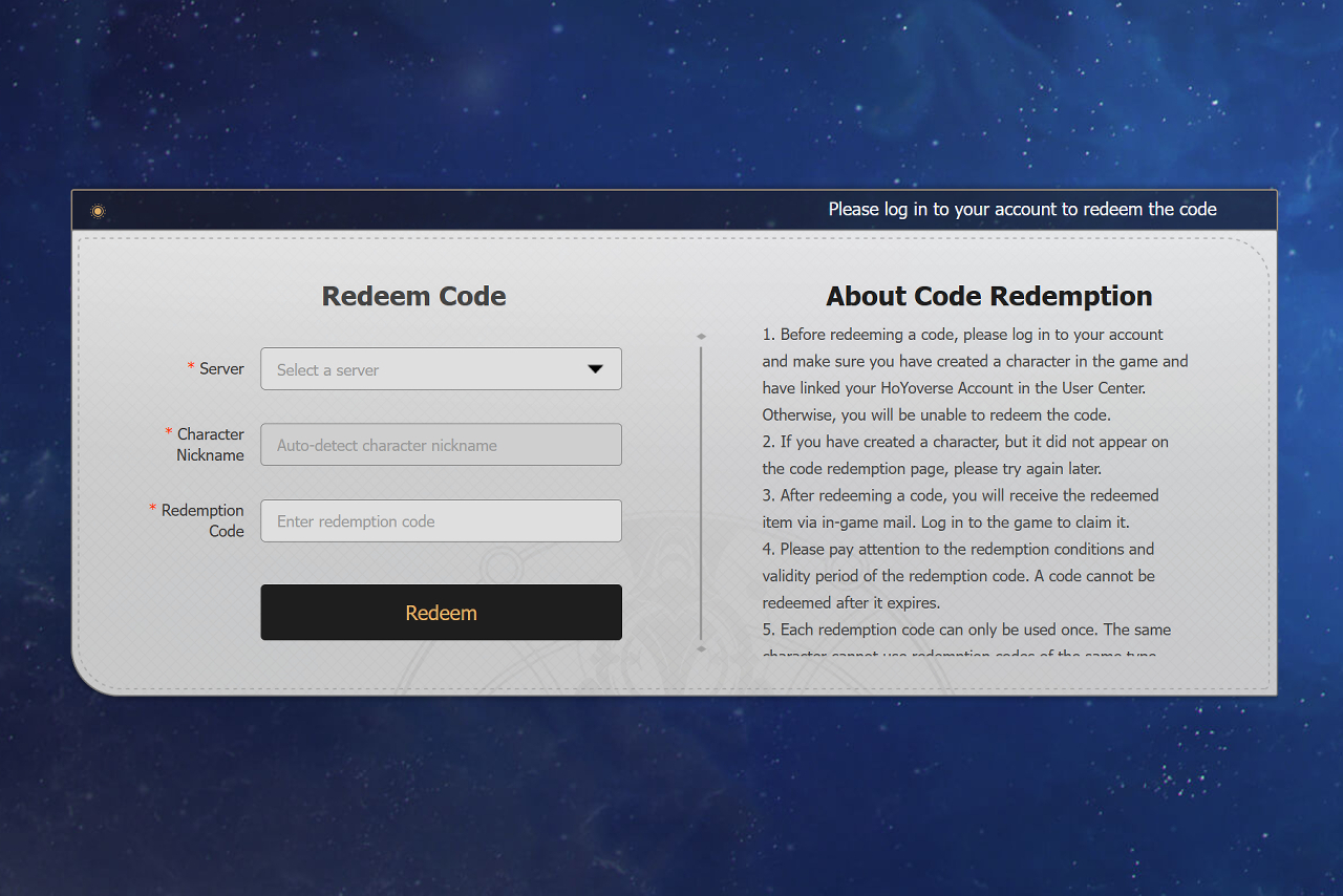 - Sign in to the official Honkai Star Rail redemption page with your HoYoverse account.