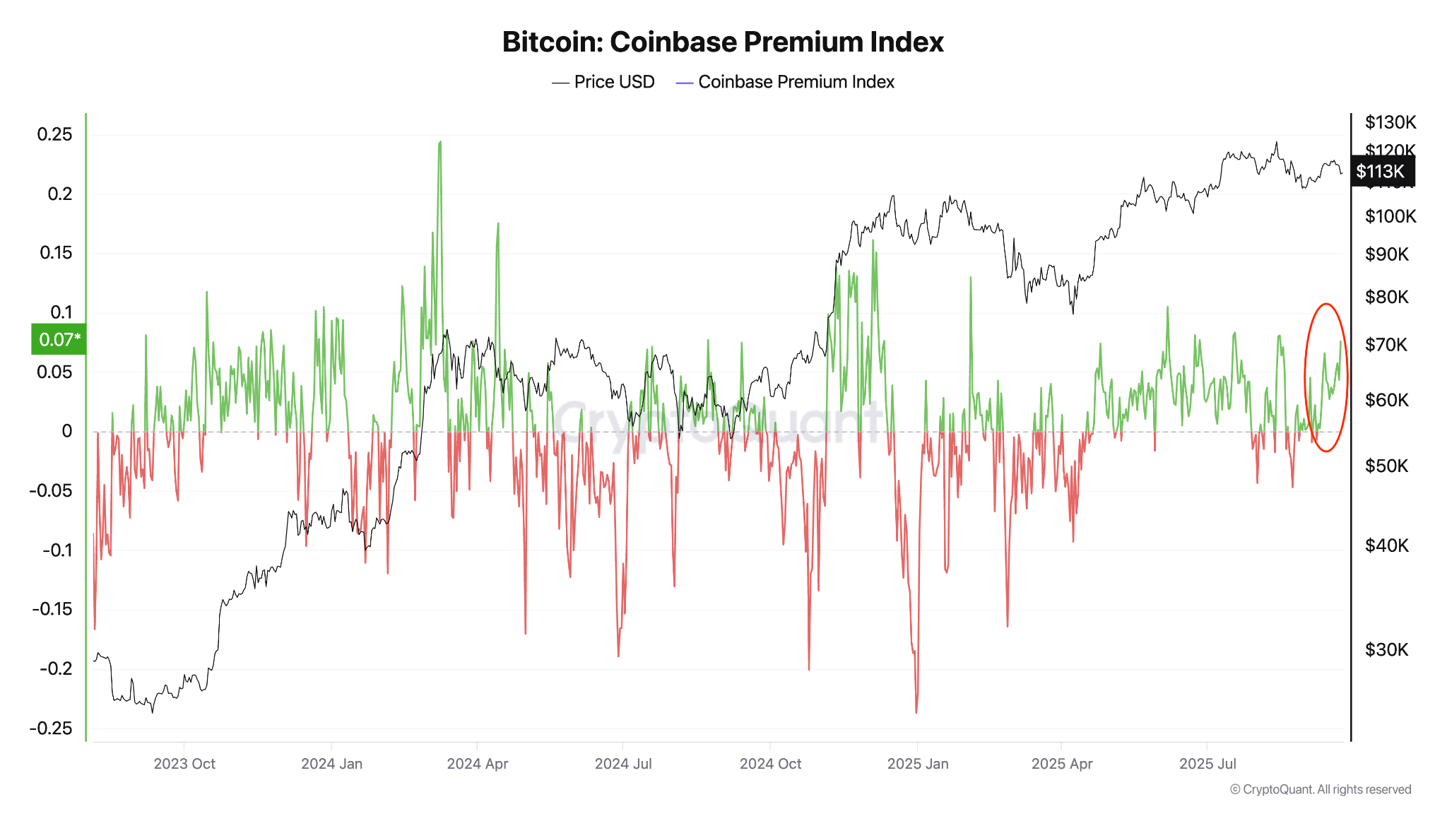 More importantly, the index remains positive, rising to 0.075 on Sept. 22 from 0.043 on Sept. 21, even as Bitcoin tumbled 4% to $112,000.