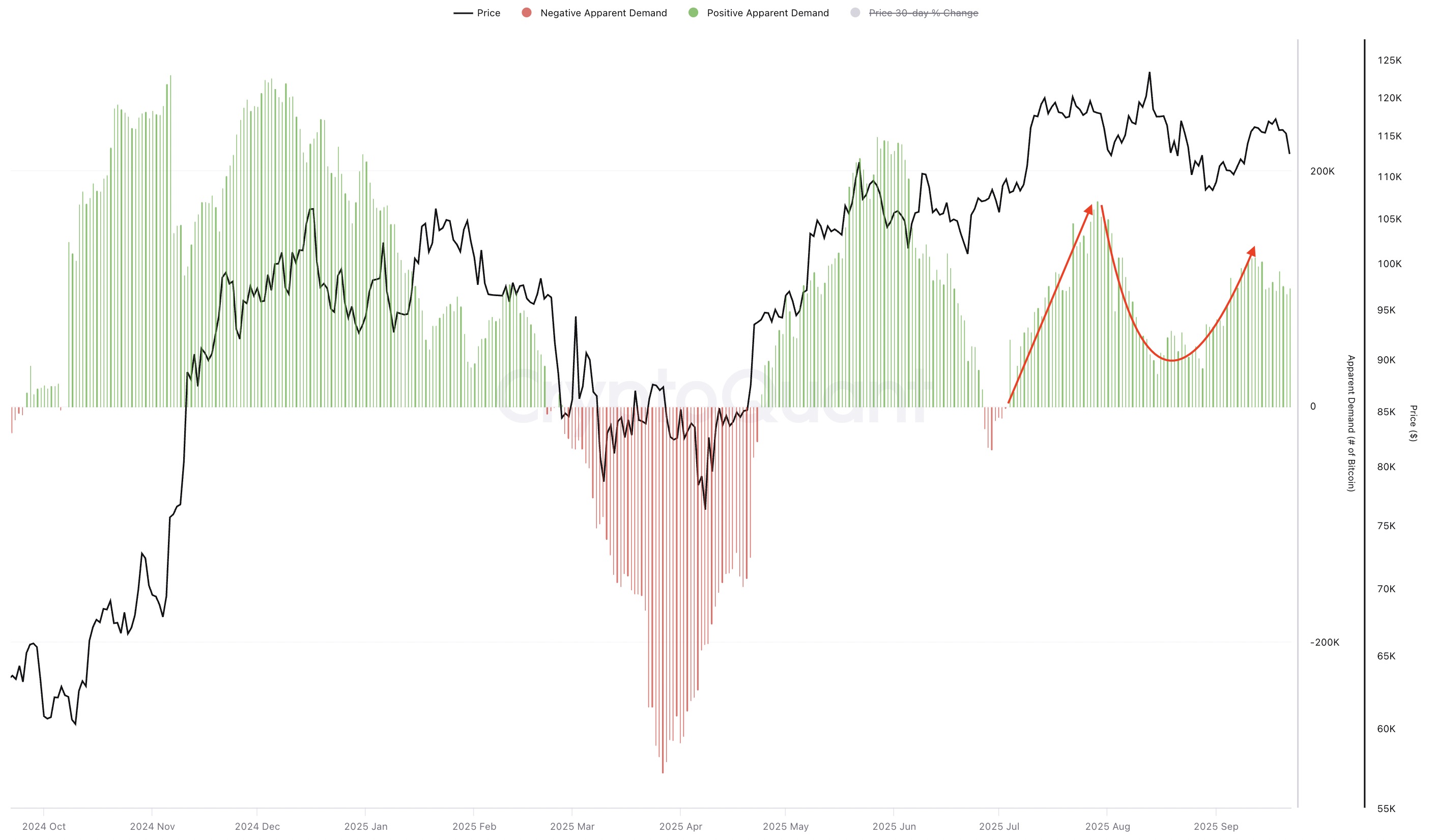 Additionally, Bitcoin’s apparent demand, which offers a broader onchain view of worldwide BTC demand, remains high despite yesterday’s price drop, with a slight increase over the last 24 hours.