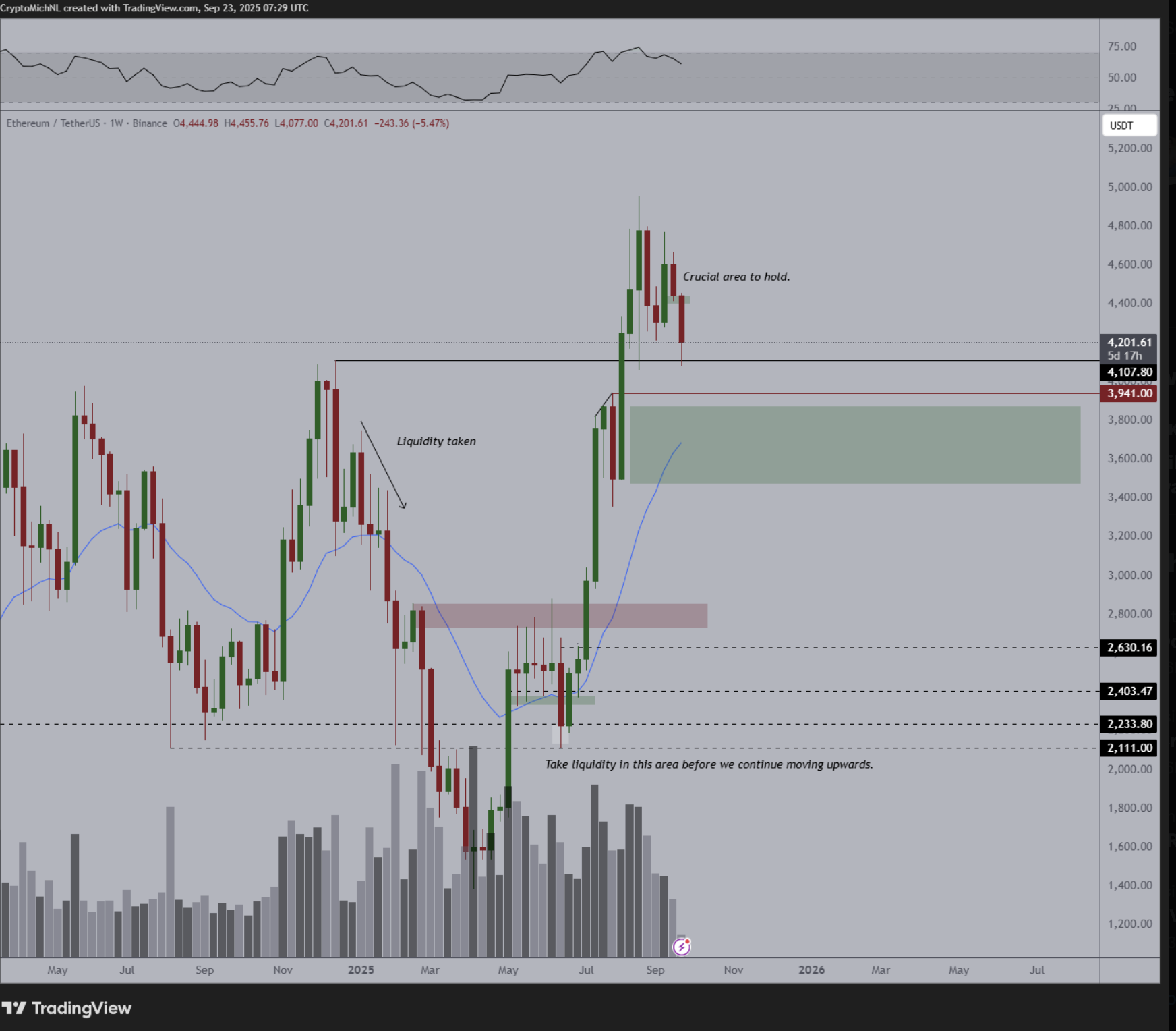 In his Tuesday post, the chartist discusses the prospects of the ETH price falling inside the $3,550-3,750 area, noting the 20-week exponential moving average (20-week EMA; the blue wave in the chart below) at around $3,685.