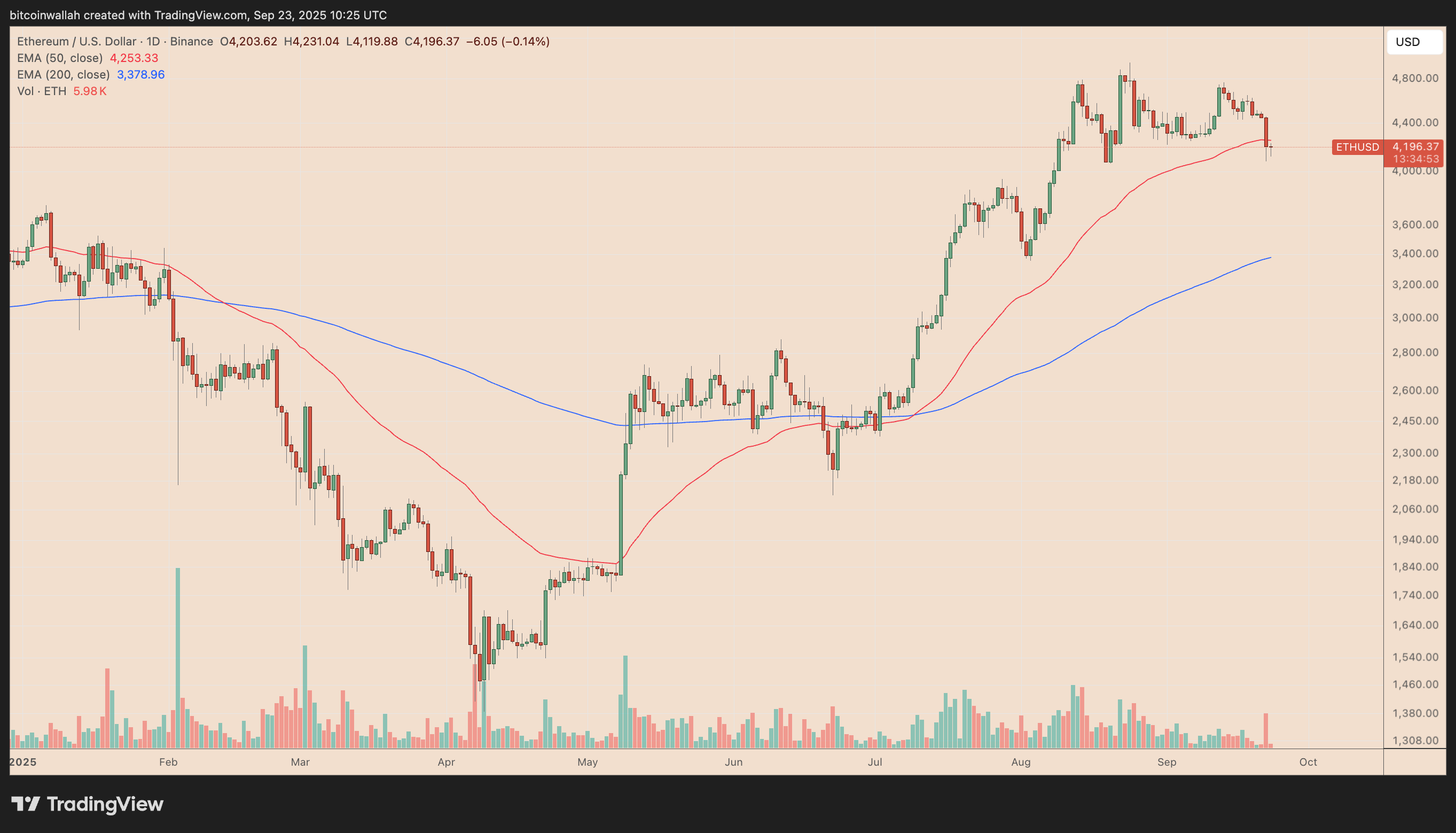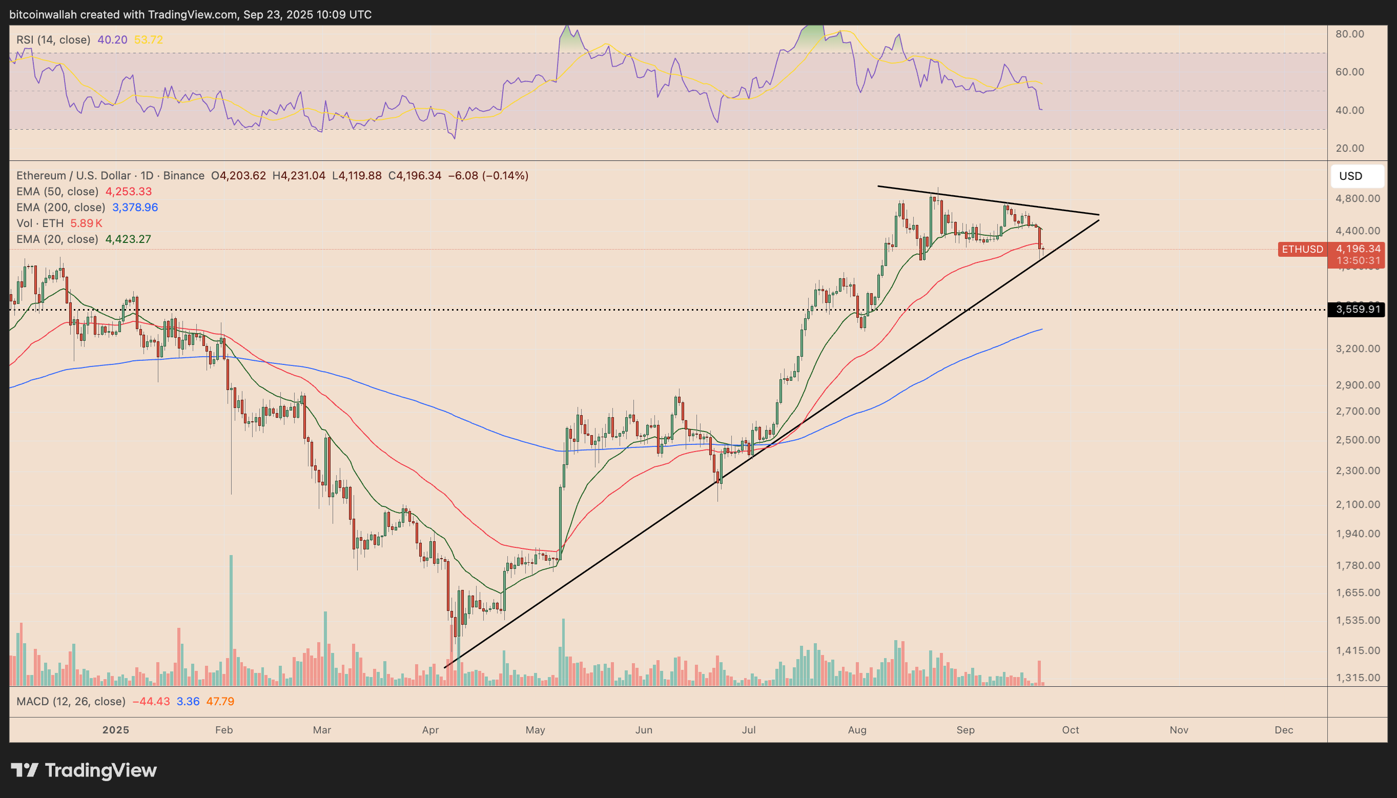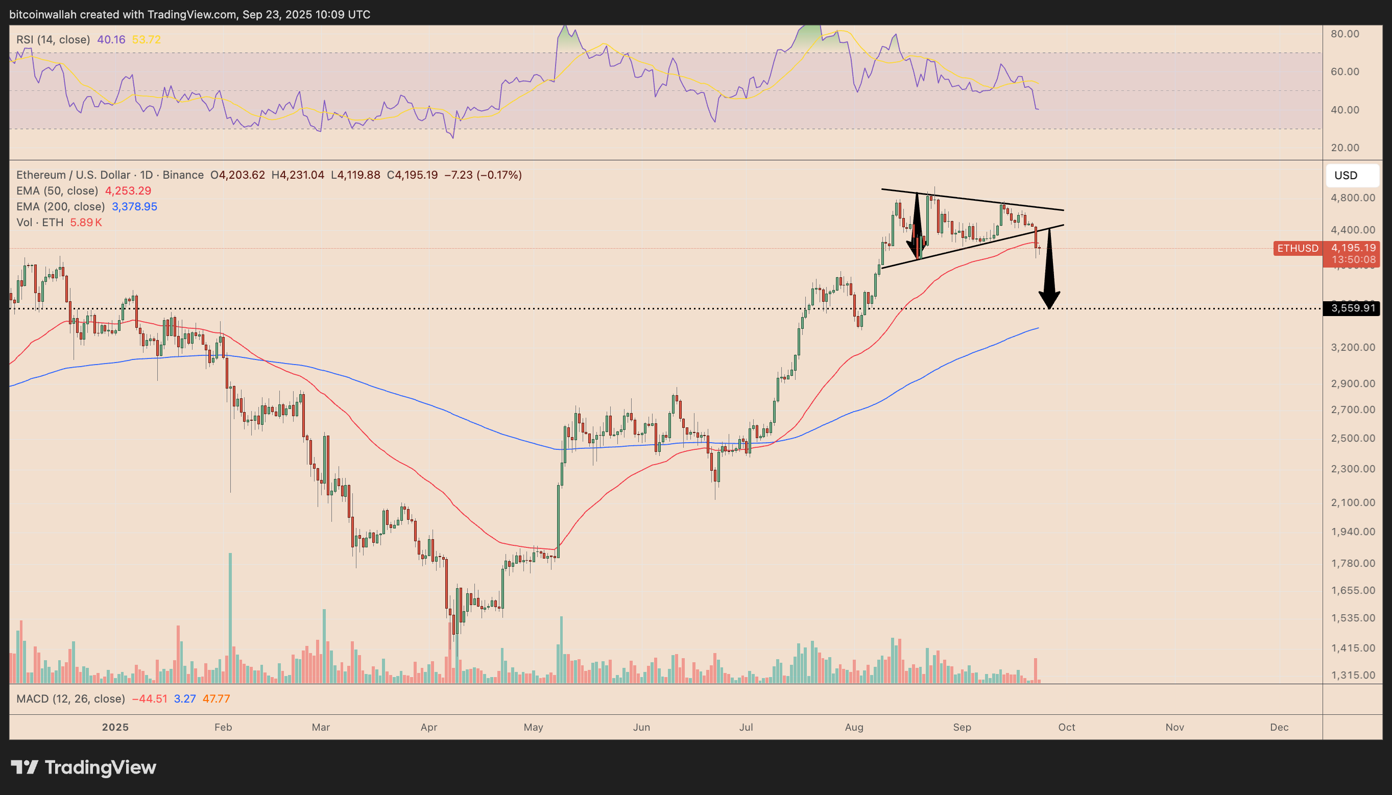 The measured move from this triangle setup points toward $3,560, suggesting ETH could fall another 15% from current levels before October if selling pressure persists.