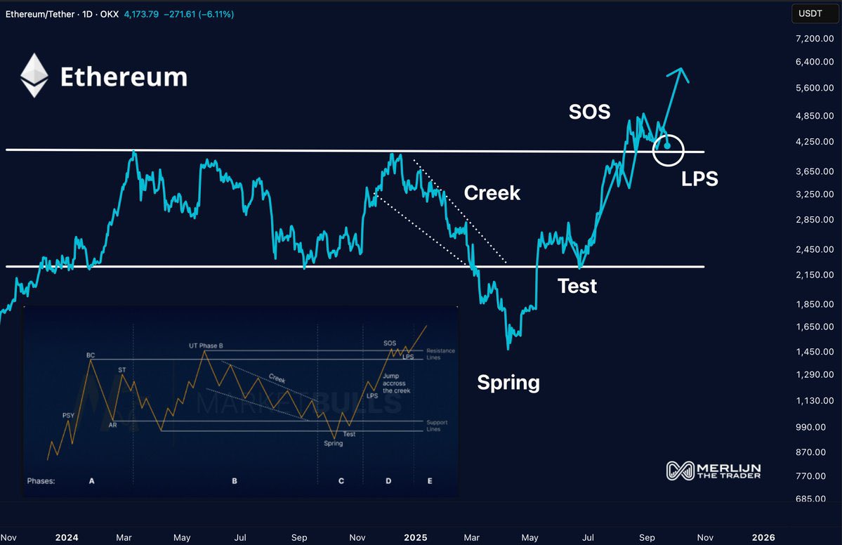 In this framework, Ethereum’s recent decline represents the “Last Point of Support” (LPS), a healthy retest of a former resistance level before price resumes higher.