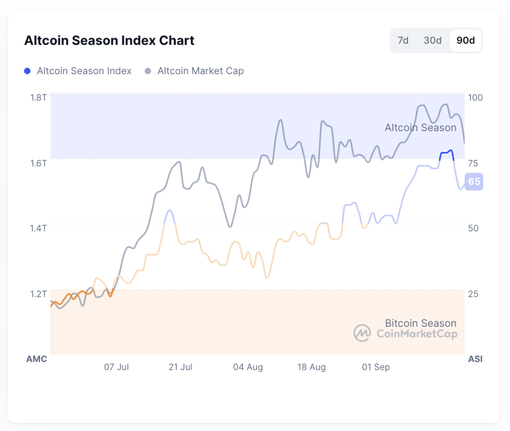 The Altcoin Season Index posted a score of 65 on Monday. (CoinMarketCap)