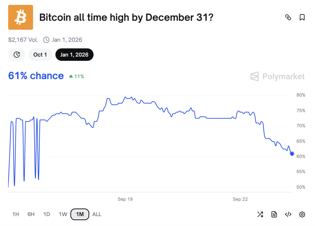 Bitcoin’s chances of reaching new all-time highs by December 31 jumped 11% over the past 30 days. (PolyMarket)