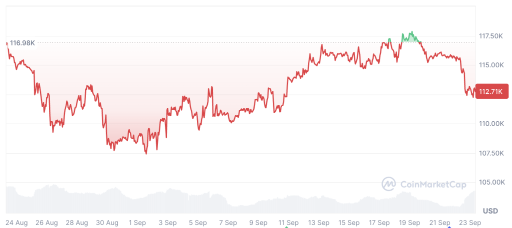 Bitcoin is trading at $112,710 at the time of publication, down 2.14% over the past 30 days. (CoinMarketCap)