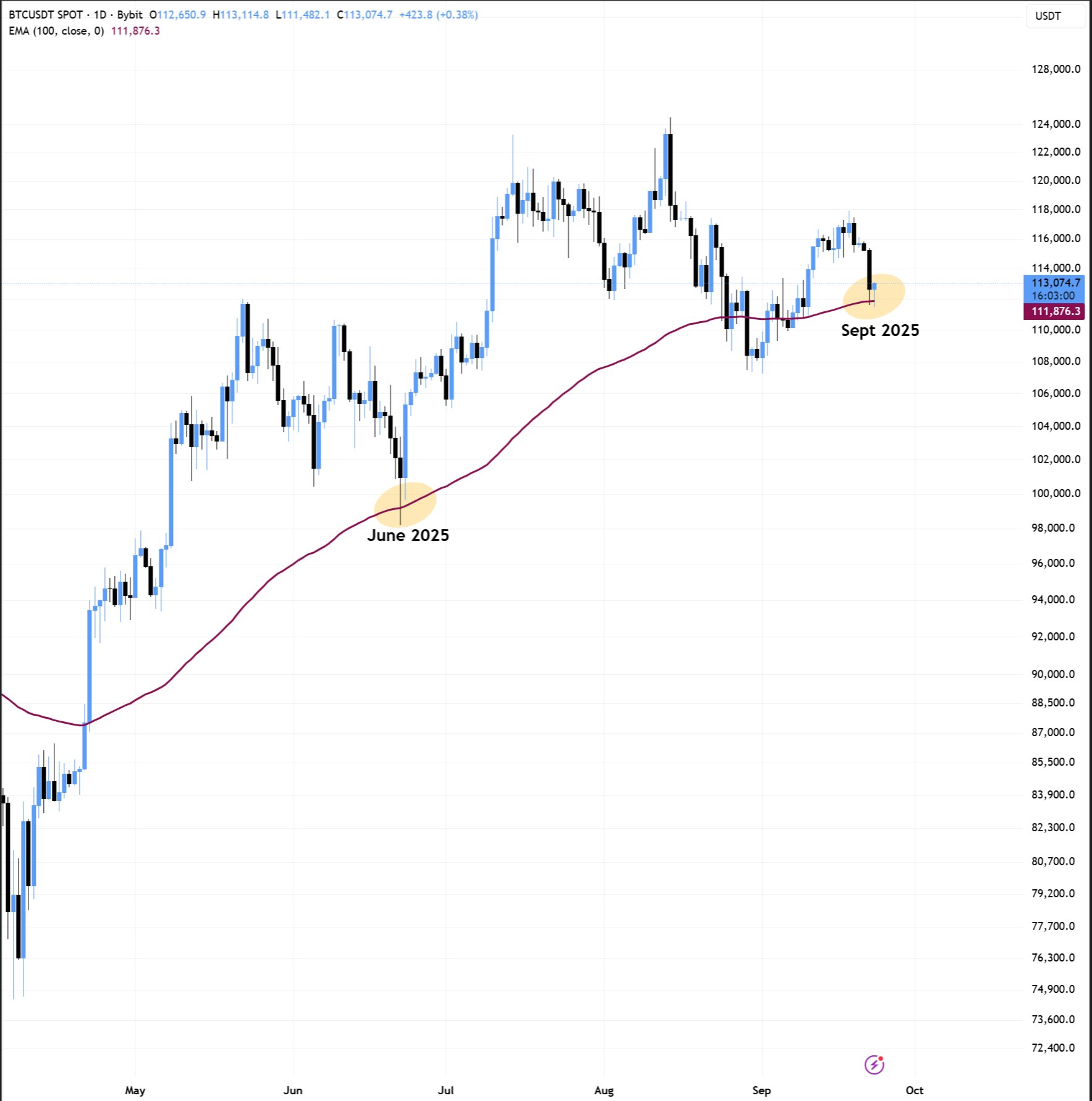 BTC/USDT one-day chart with 100EMA. Source: BitBull/X