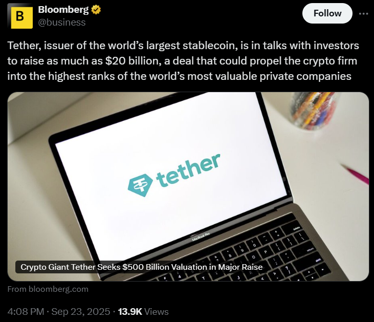 Bloomberg, citing people familiar with the matter, said Tether is considering raising between $15 billion and $20 billion in exchange for about a 3% stake through a private placement, with Cantor Fitzgerald acting as lead adviser.