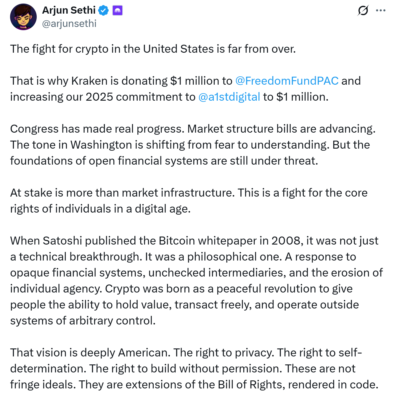 In a Tuesday post on X, Kraken co-CEO Arjun Sethi announced that the exchange will donate $1 million to the Freedom Fund PAC and increase its 2025 commitment to America First Digital to $1 million.