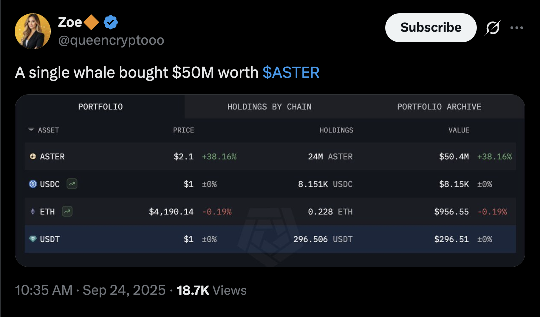 Other large investors have also piled into ASTER, with one wallet buying as much as $50 million in a single day this week and another putting in $14 million.