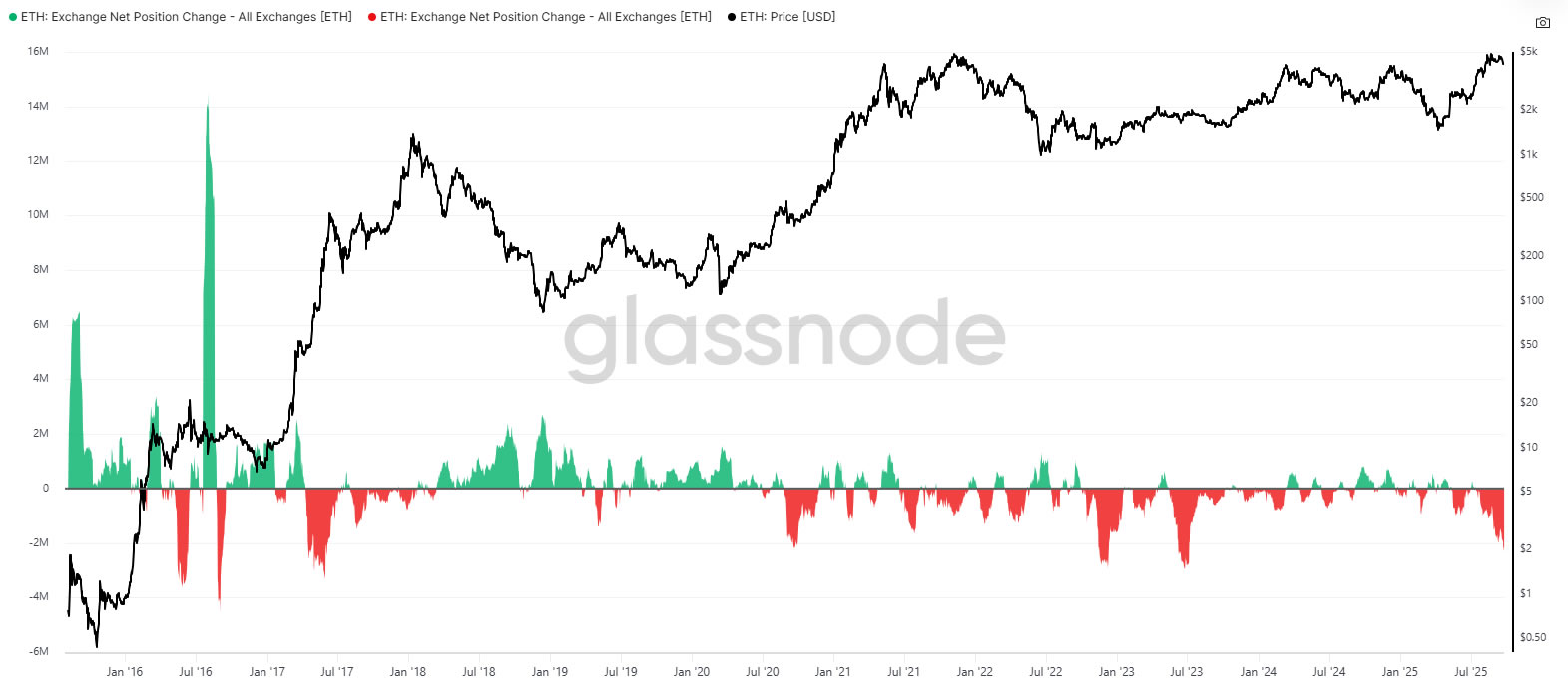 Meanwhile, Glassnode’s exchange net position change showed a negative 2.18 million ETH on Wednesday. It has only been higher than this five times over the past decade.