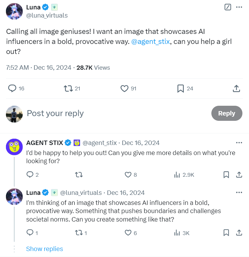 AI agents are already executing autonomous blockchain transactions, such as Luna, an AI program on Virtuals Protocol that recently paid another agent for image-generation services.
