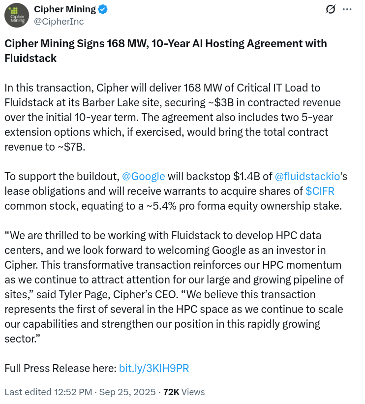 Google will backstop $1.4 billion of Fluidstack’s lease obligations to Cipher Mining. In exchange, the internet giant will receive warrants to acquire approximately 24 million shares of Cipher common stock, equating to an approximately 5.4% pro forma equity ownership stake.