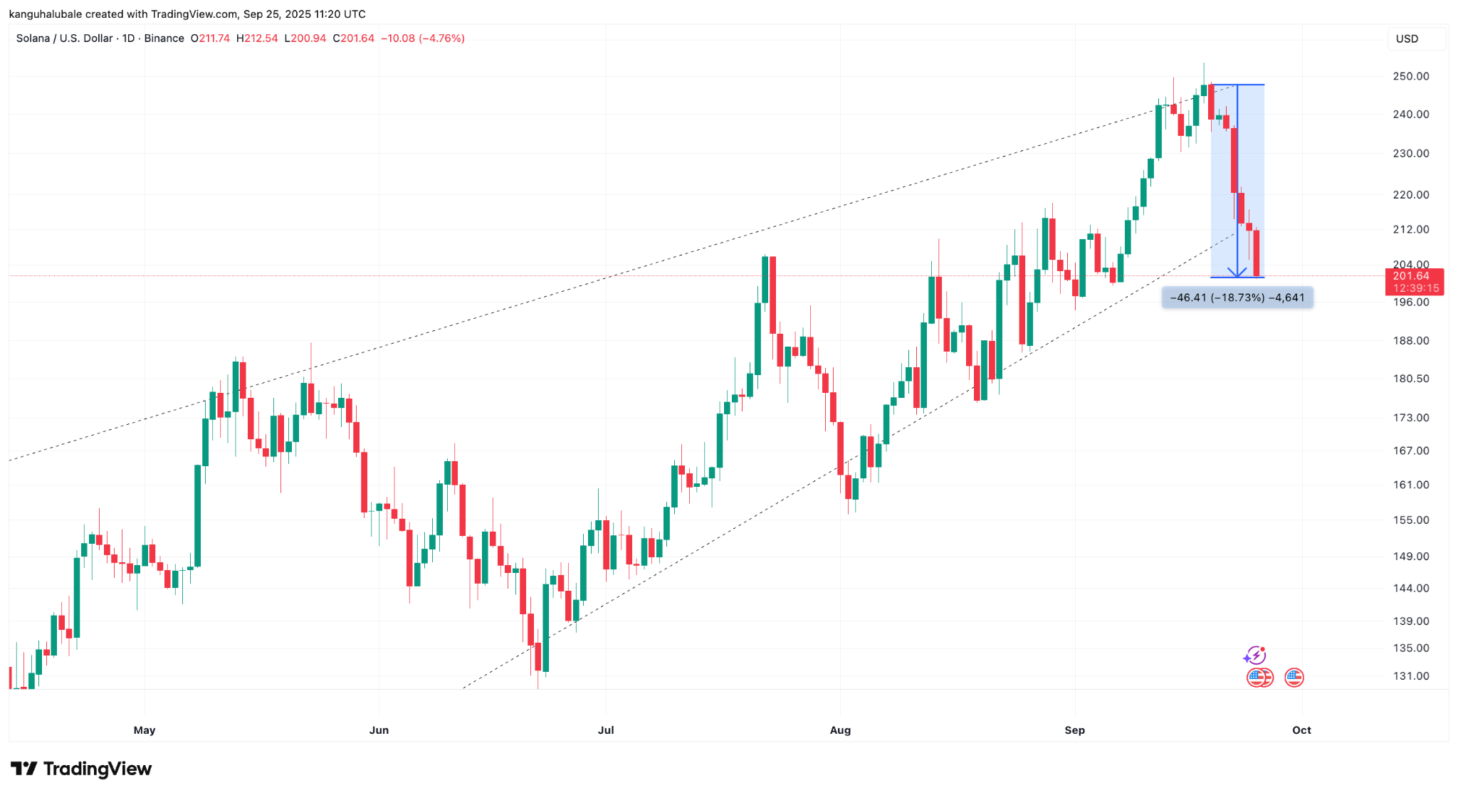 Solana (SOL) had one of its worst weeks of 2025, down 18% in the past seven days, trailing only Hyperliquid among the top 20 crypto assets in losses.