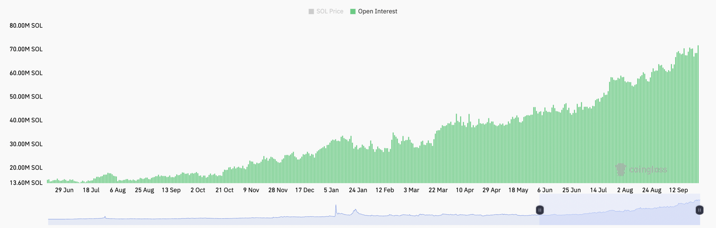 CoinGlass data shows Solana’s futures open interest (OI) hit a record 71.8 million SOL with $14.5 billion at the time of writing on Thursday. Similarly, perpetual funding rates flipped positive to 0.0043% from -0.0065% with the jump in OI.