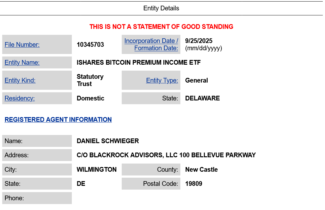 Asset management giant BlackRock filed to register a Delaware trust company for its proposed Bitcoin Premium Income ETF on Thursday, signaling a push to broaden its Bitcoin offerings.