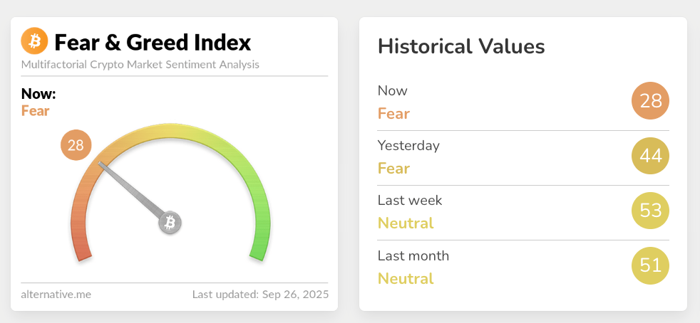 The Crypto Fear & Greed Index, a popular tool for measuring overall market sentiment, tumbled below 30 on Friday — its lowest level since April 2025 — signaling strong caution and heightened fear among investors, as shown on the official index site.