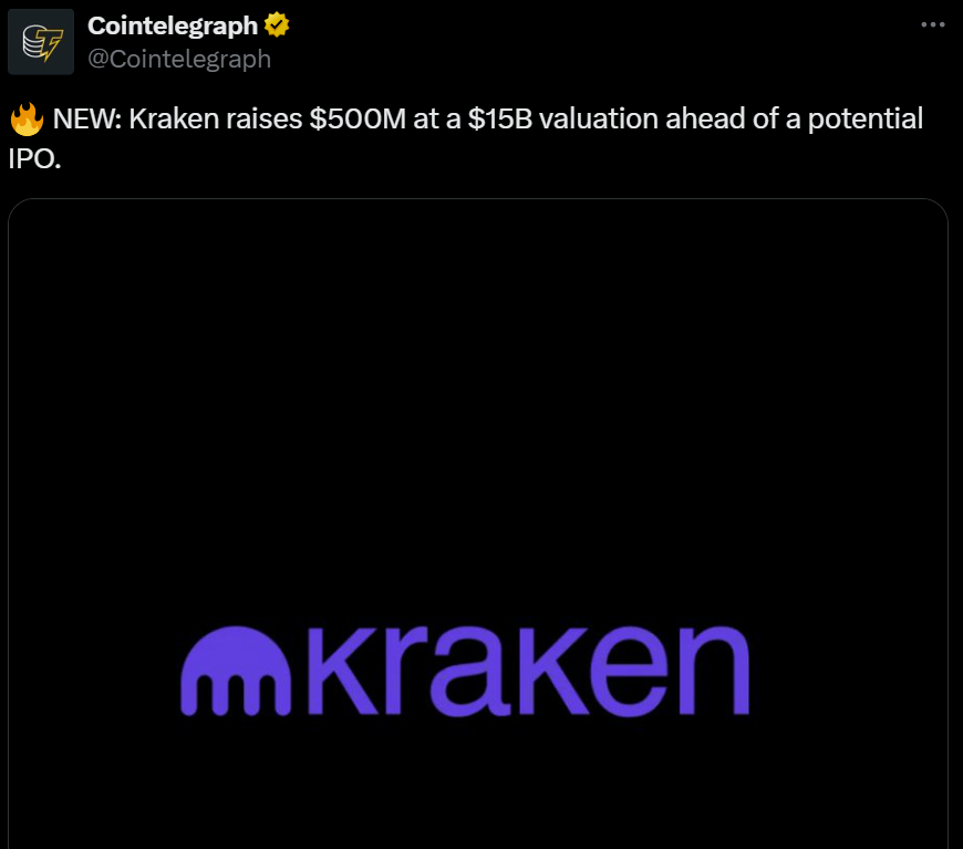 The raise and valuation are broadly in line with Cointelegraph’s reporting in July, which revealed that Kraken was seeking $500 million at a $15 billion valuation — a move widely interpreted as a step toward IPO readiness.