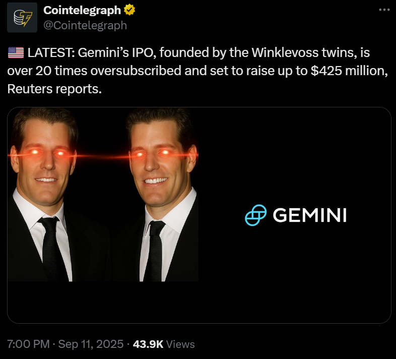 Gemini, the exchange founded by Cameron and Tyler Winklevoss, was over 20 times oversubscribed in its Nasdaq debut, raising $425 million. Since going public earlier this month, its market capitalization has swelled to over $2.8 billion.