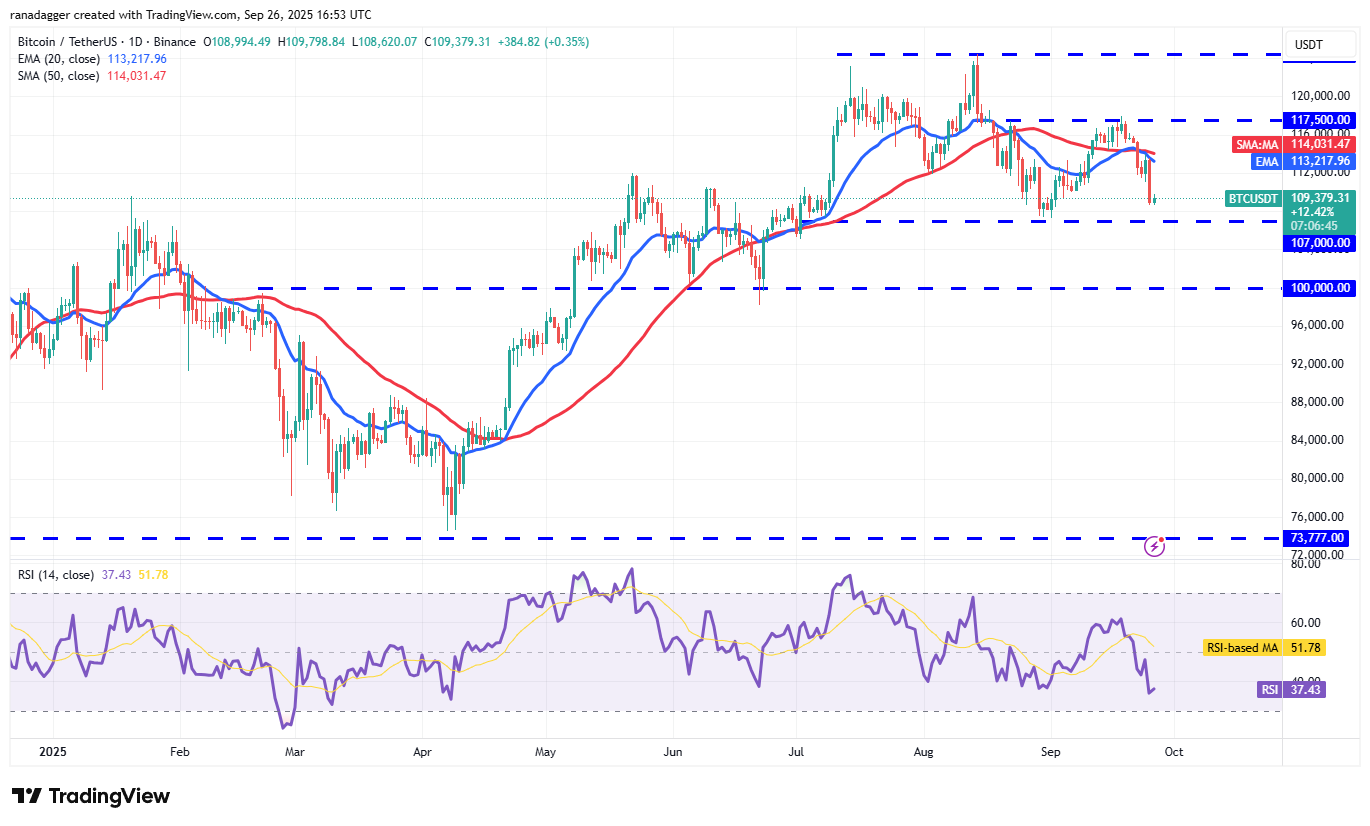 Could BTC rebound off the $107,000 support with strength, pulling altcoins higher? Let’s analyze the charts of the top 10 cryptocurrencies to find out.