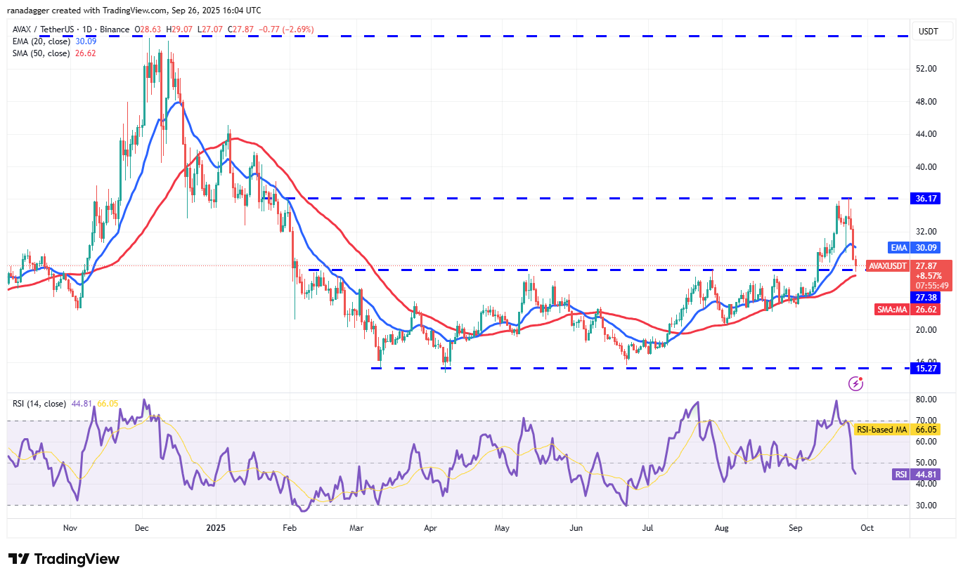 The AVAX/USDT pair has declined to the 50-day SMA ($26.62), which is likely to attract buyers. If the price rebounds off the 50-day SMA and rises above the 20-day EMA, it suggests buying at lower levels. The Avalanche price could then consolidate between $26.50 and $36.17 for some time.