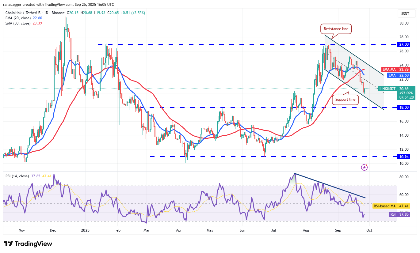 Any recovery attempt from the support line is likely to face selling at the 20-day EMA ($22.60). If the price turns down sharply from the 20-day EMA, the bears will make one more attempt to sink the LINK/USDT pair below the descending channel. If they manage to do that, the Chainlink price could sink to $18 and subsequently to $16.