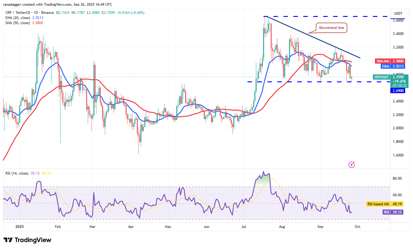 XRP (XRP) turned down from the 50-day simple moving average ($2.98) on Wednesday and fell to the solid support at $2.69 on Thursday.