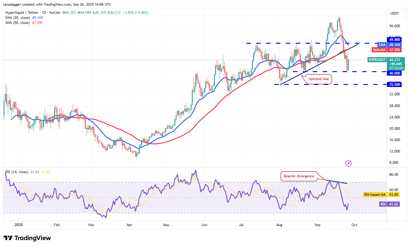 The relief rally is expected to face selling at the moving averages. If the price turns down sharply from the moving averages, the bears will make one more attempt to sink the HYPE/USDT pair below $40. If they can pull it off, the Hyperliquid price could plummet to $35.50.