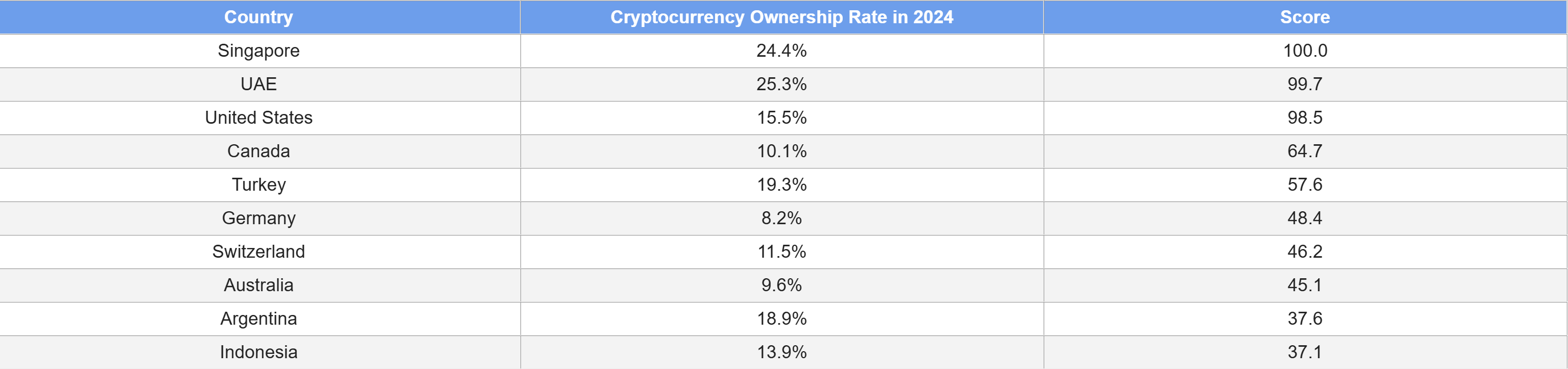 Singapore claimed the number one spot with a composite score of 100, driven by 24.4% of its population owning crypto and leading the world in search activity, with 2,000 crypto-related queries per 100,000 people. In 2021, only 11% of Singaporeans held digital assets, but that figure more than doubled by the following year.