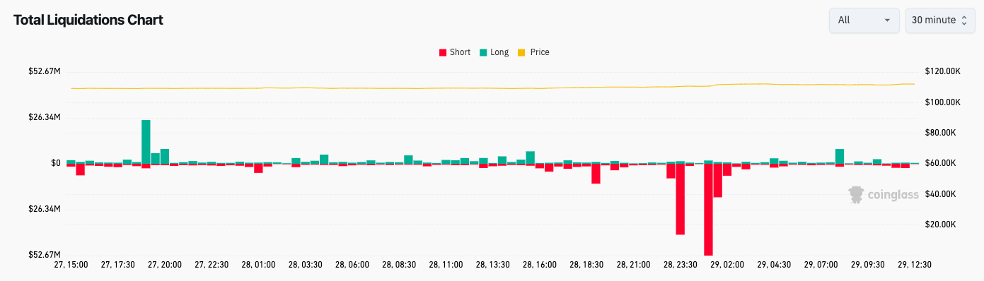 CoinGlass data shows how price sliced through late short positions, with large players subsequently adding more ask liquidity around $113,000.