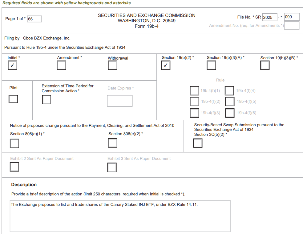 The CBOE’s 19b-4 filing, submitted Monday, comes shortly after investment firm Canary Capital filed an S-1 application for a staked Injective (INJ) token fund with the US Securities and Exchange Commission (SEC) last Thursday, Cointelegraph reported.